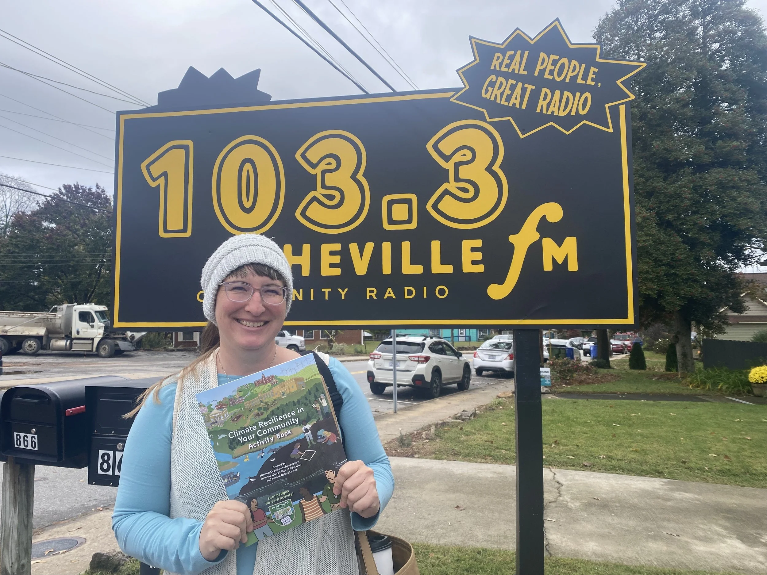 Liz Cox, of the NCICS, standing in front of the 103.3 AshevilleFM sign. She holds a workbook titled, “Climate Resilience in Your Community Activity Book” by the National Oceanic and Atmospheric Administration’s Office of Education and Nurture Nature Center.